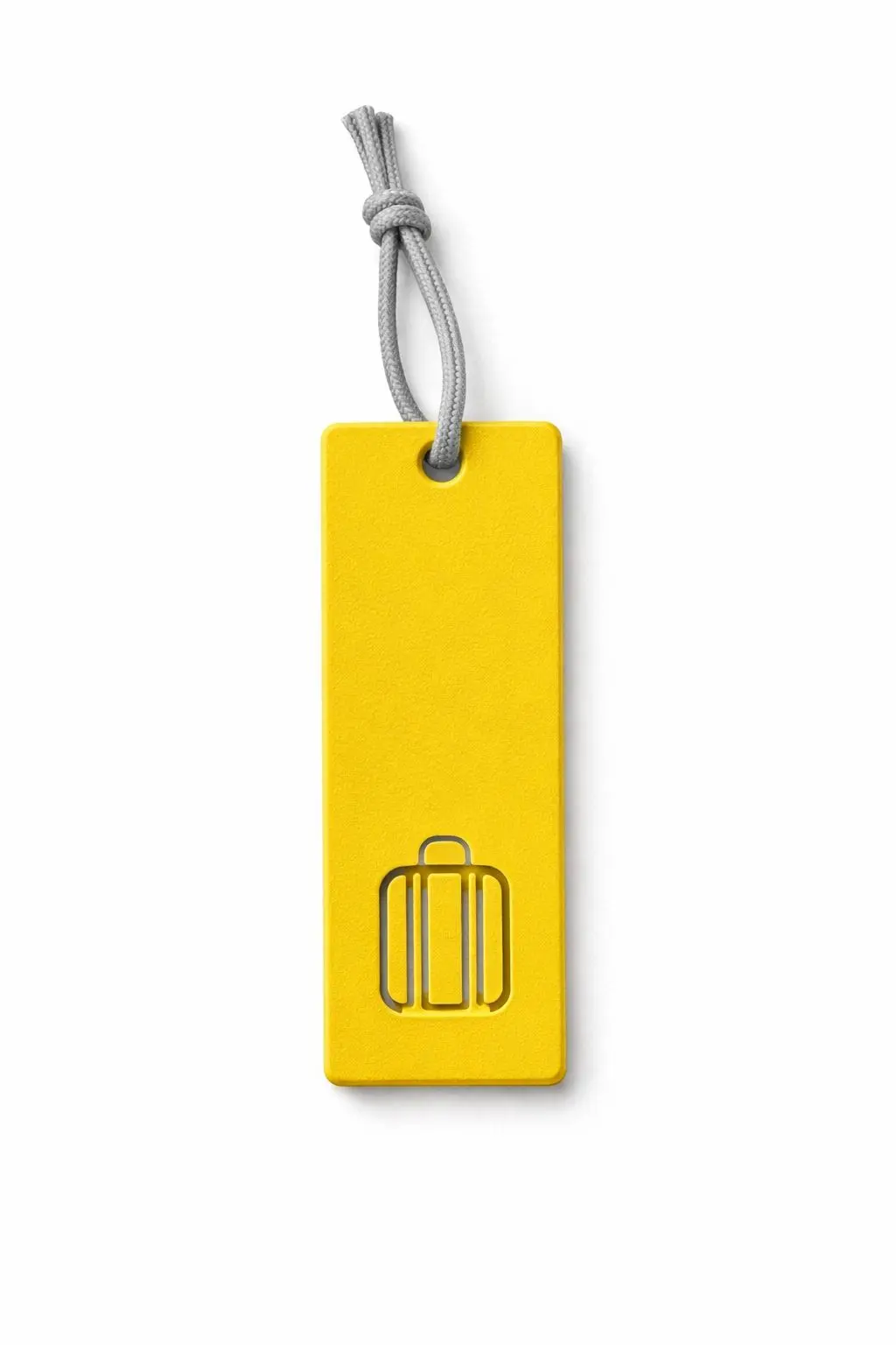 Amarela com o ícone da mala gravado. Pequena, mas inconfundível.